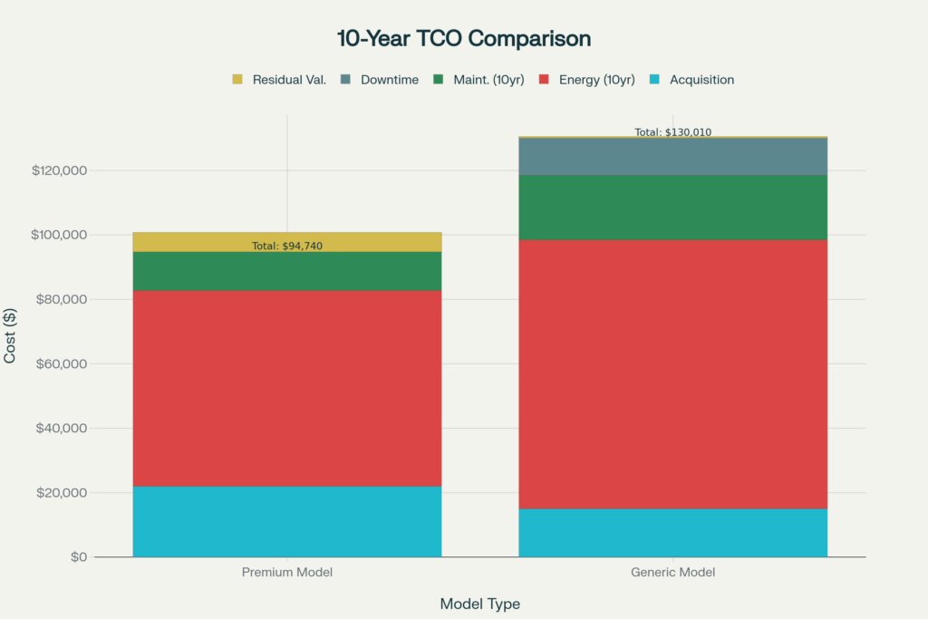 Total cost of ownership (TCO) reveals the true financial impact of equipment decisions. The comprehensive formula captures five cost components: TCO = Acquisition + (Energy × Lifespan) + Maintenance + Downtime Costs – Residual Value