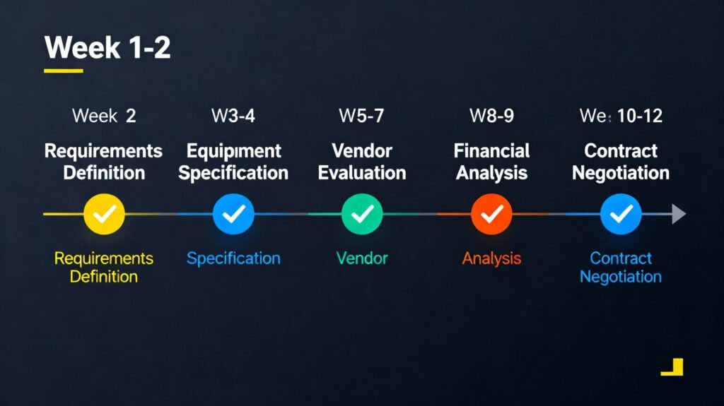 Equipment procurement done right follows a phased approach that aligns your operational needs, compliance requirements, and financial stakeholders before purchase orders are signed. Here’s the execution framework we’ve used with 200+ successful kitchen build-outs: