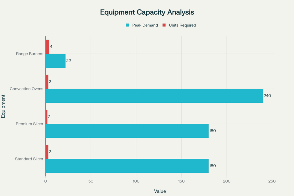 Let’s walk through a practical example. Your lunch concept projects 180 orders during the 12:30–1:30 PM rush. Your signature sandwich requires slicing turkey on a commercial slicer. A standard commercial slicer processes approximately 80 portions per hour, accounting for protein loading and cleaning between batches. Your calculation: 180 ÷ 80 = 2.25, meaning you need at least two slicers to avoid creating a prep bottleneck.
